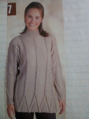 Háta: 150 szemre kezdjük el,és 4 cm - es patentmintás szegély után az alapmintával folytatjuk a munkát:Egyenes oldalszélekkel dolgozunk a raglán vonaláig ( 40 cm - ig ). melynek fogyasztása megegyezik az elejénél leírtakkal.A nyakkivágásban ( középen ) megmaradt 34 szemet a patent után 70 cm - rel 1 sorban befejezzük.