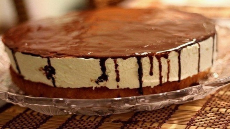 A csokoládét az olajjal együtt vízgőz felett felolvasztjuk. Amikor a krém megdermedt, levesszük a forma oldalát és a csokoládét rácsorgatjuk.